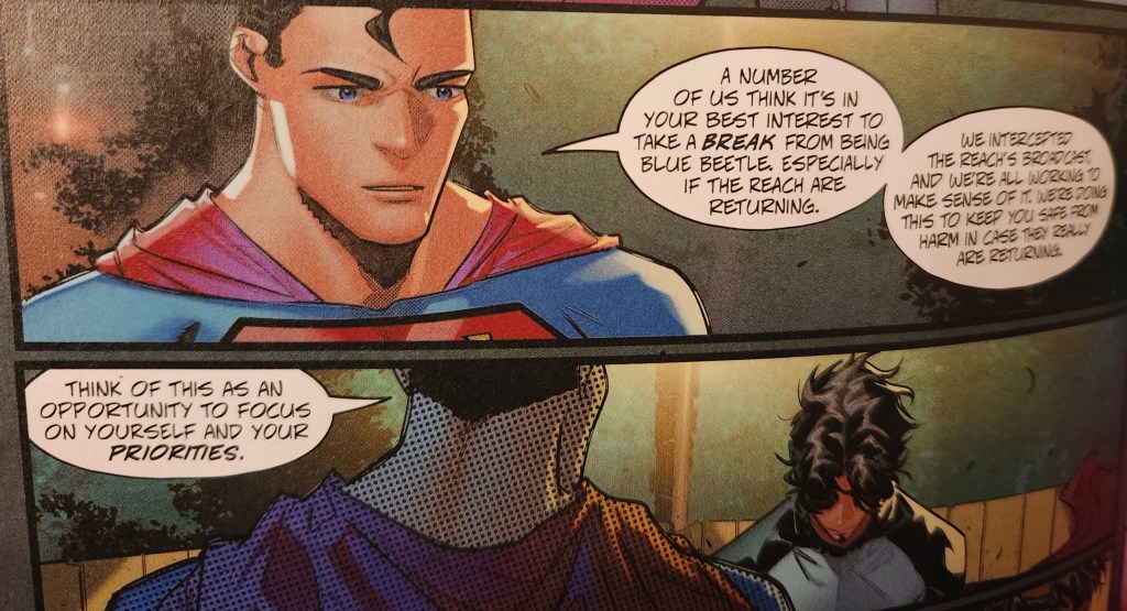 While his lifestyle is being established for the reader, Jaime is rocketed into space by his scarab, where it begins speaking in “reach”, which freaks Jaime out. As Jaime returns to Earth, he walks into his graduation party, only to be greeted by Superman! It is then Superman asks to speak with Jaime, and after congratulating Jaime on his achievement (and speaking Spanish with Jaime’s mother), Superman announces he is grounding Jaime—in fact, all the heroes are grounding Jaime for his own good. After leaving Jaime, Superman reveals in a conversation with Batman that the Reach are returning. And Jaime isn’t to be trusted.