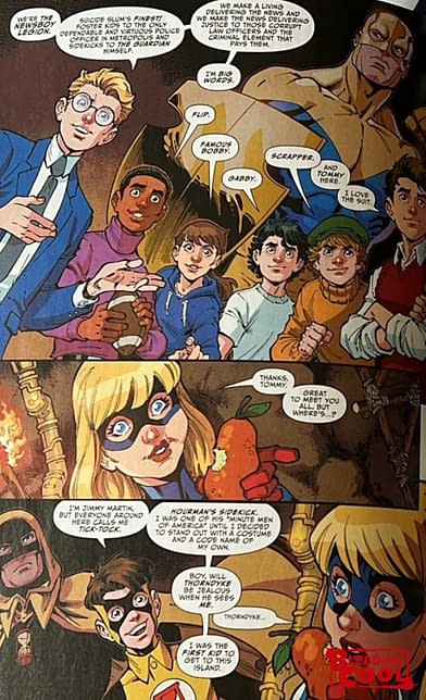 Meanwhile, Courtney, having been rescued by a small band of sidekicks, mistakenly tries to find a way off the island. She fails miserably, calling the attention of the island goons again, needing to be rescued by Wing for a second time. At this point, Wing leads Courtney to a cave filled with caped-crusading kids—this is the moment Courtney meets The Lost Children.