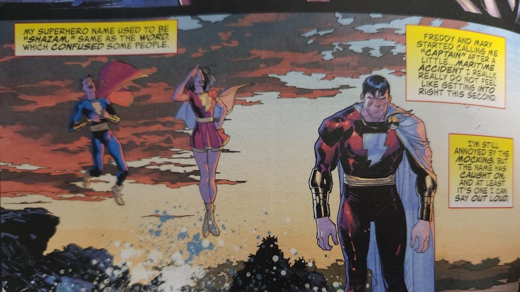 We also learn why Shazam is being called “The Captain” in Waid’s run. In-story it is because Billy accidentally said “Shazam” and turned back into Billy over the ocean—he got soaked and Freddy and Mary laughed and continue to mock him about it. Out-of-story, Waid wants the character to be able to say his name without transforming. It’s a flaw Shazam has had since Marvel Comics obtained the rights to the name “Captain Marvel”. Either way, Shazam cannot tell his superhero name to anyone, so a name change just makes sense.