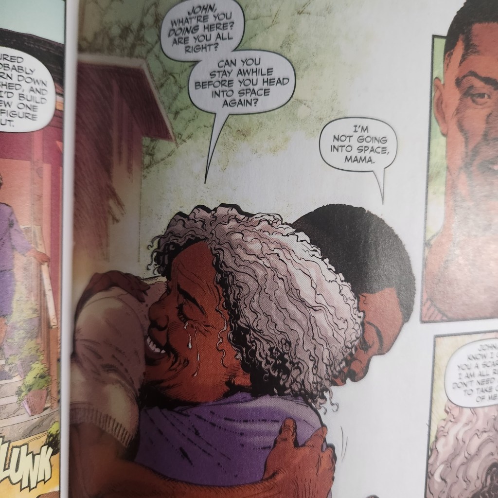 In the backup feature, John Stewart reunites with his mother, telling her he’s done with searching. He’s on Earth to stay. Though he manages to avoid mentioning he is no longer a lantern.