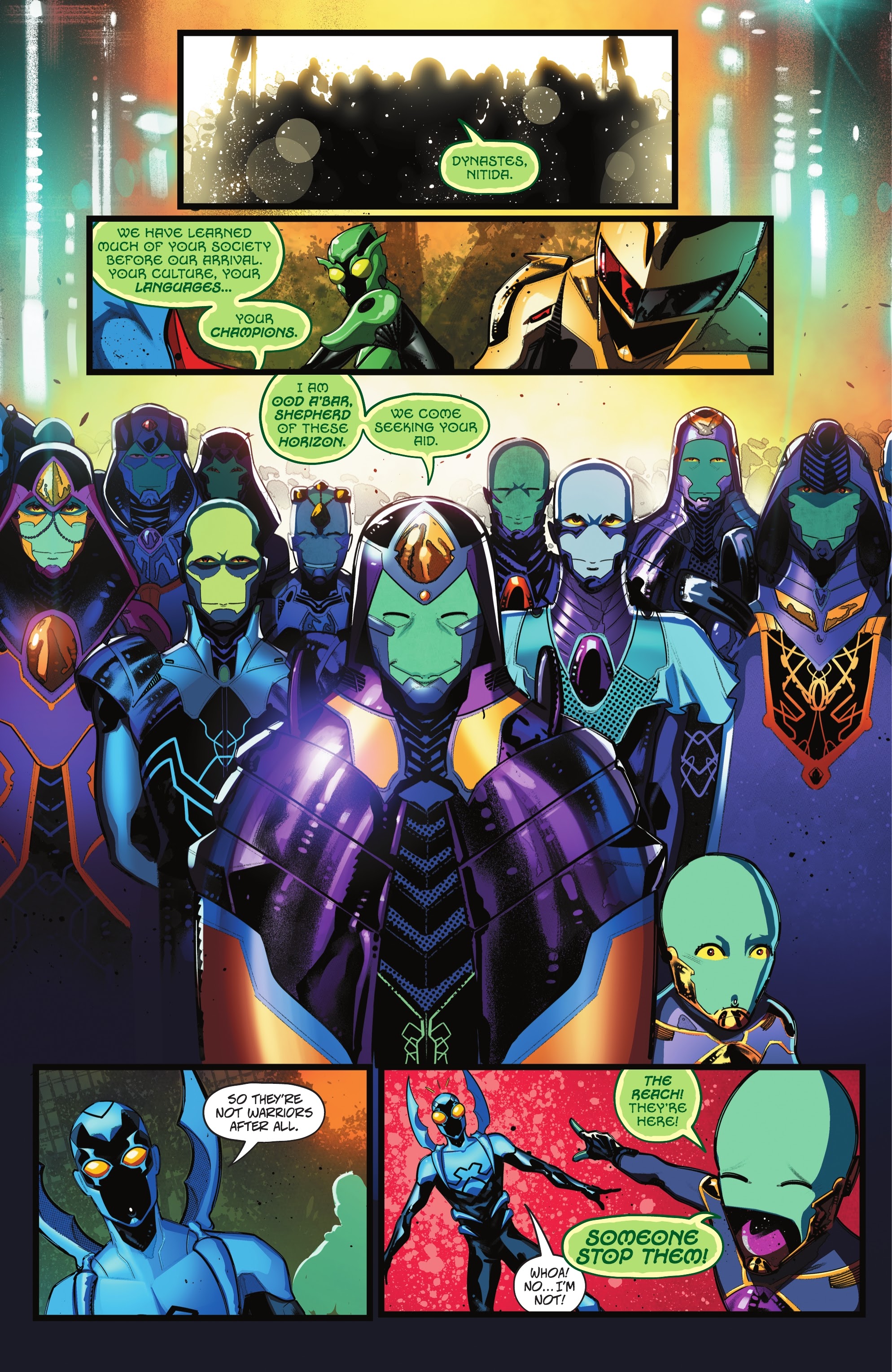 As the Horizon introduce themselves, it is revealed the purpose of the new beetles was to scout—to learn the language and customs of people on Earth. They are delighted to see the Green and Yellow Beetles, but are enraged by the presence of Blue Beetle. They doubt the Blue Beetle could defy its programming—forgetting they had done the same. After Superman vouches for Blue Beetle, The Horizon believe.